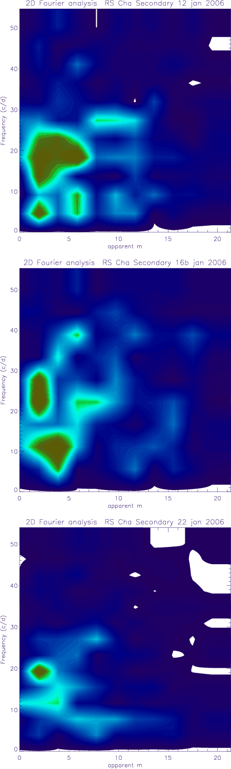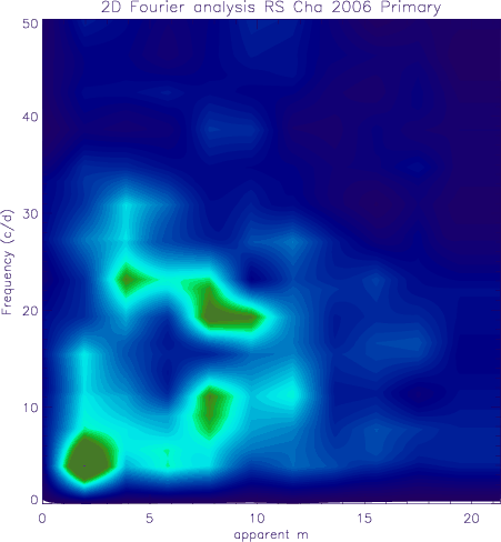 Andersen (1975) already reported small amplitude radial velocity variations on top of the binary radial velocity curve for both components of RS Cha, suggesting the possible presence of stellar pulsations. Photometric observations by McInally & Austin (1977) revealed short-term variations in at least one of the two components, possibly linked to stellar pulsations. Very recently, Alecian et al. (2005) reported radial velocity variations in the residual velocity frame (cleaned for orbital velocity) with amplitudes up to a few km s-1 and periods of the order of 1h, indicative of