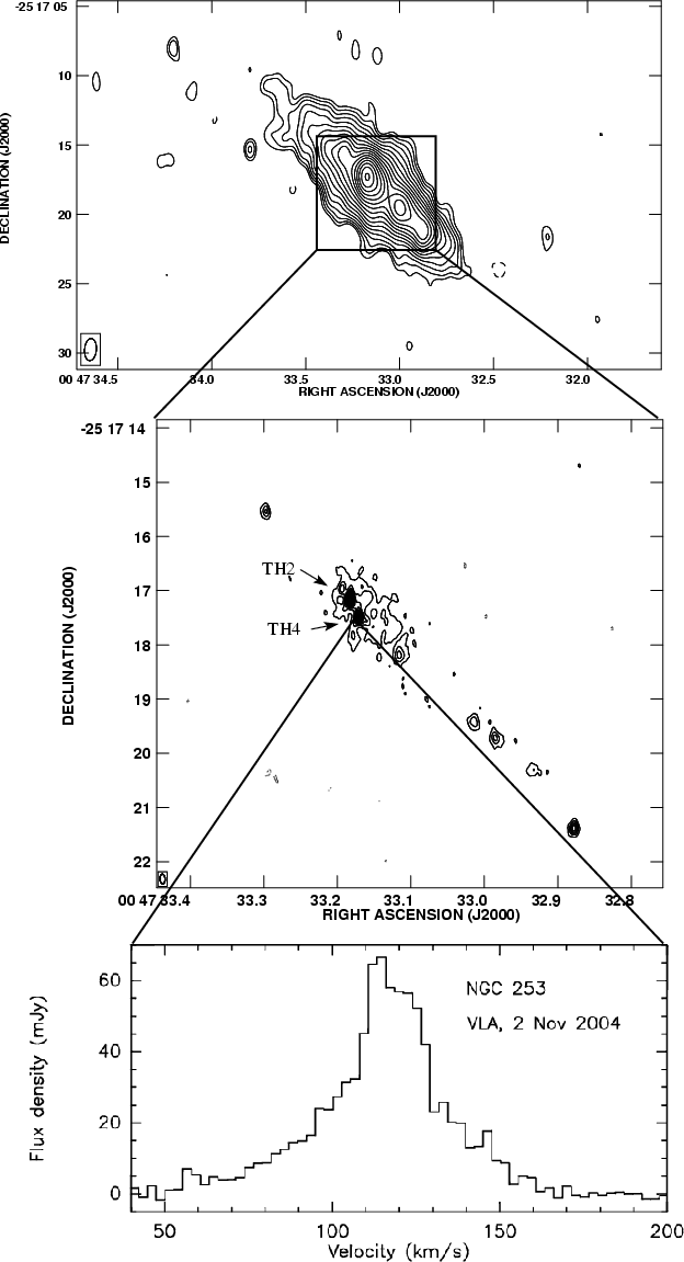Since we used only a single VLA antenna during the geodetic-like observations, we could simultaneously observe NGC 253 with the remaining antennas in spectral line mode. We used a total bandwidth of 12.5 MHz and 64 spectral channels, yielding a channel spacing of 2.63 km s-1 and covered a velocity range of 168 km s-1. We employed fast switching between NGC 253 and the nearby phase calibrator 0120-270. The total integration time on NGC 253 was 24 minutes. The data were also calibrated using standard techniques in AIPS. 3C 48 was used for the flux density calibration. After amplitude and phase calibration on 0120-270 we performed first a phase self-calibration and then a phase & amplitude self-calibration using our image from the continuum observation. Finally, we subtracted the continuum emission from the uv-data set.