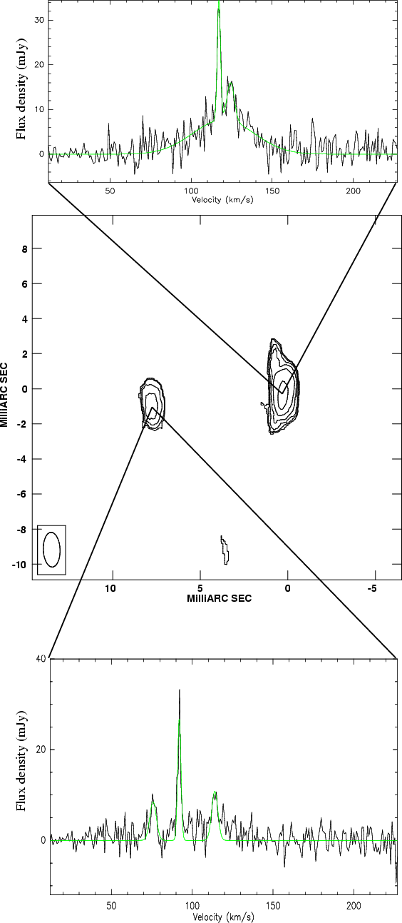 Figure 1: Middle panel: velocity integrated water maser emission in NGC 253 from the VLBI observation on 2008 March 24 at the position of TH4. The contours start at 7 mJy km s-1 and increase with factors of 2. Upper panel: spectrum of the western feature, containing one broad and two narrow components. Lower panel: spectrum of the eastern feature, containing three narrow components. |