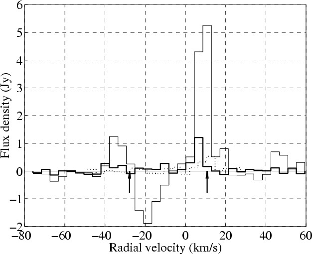 OH359.971-0.119 was detected with moderate to good S/N. However, the CO line is narrow and close to the ``red-shifted'' OH line component, i.e. the backside of the envelope (Fig. 3). A similar, but considerably weaker, line was observed with the NMA at 115 GHz (dotted line). Notice that the line profile obtained when all the uv data were included (thin solid line) shows a much stronger and broader ``red-shifted'' line and even a ``blue-shifted'' counterpart. The ``negative signal'' near -20 km s-1 is probably caused by a ``dip'' in the interstellar background, as discussed above, but in this case it is resolved.