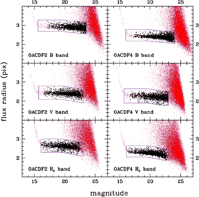 Figure 1: Selection of point sources objects from the OACDF catalogs. The polygons represent the regions where the point-like objects are concentrated (see the text for more details). |