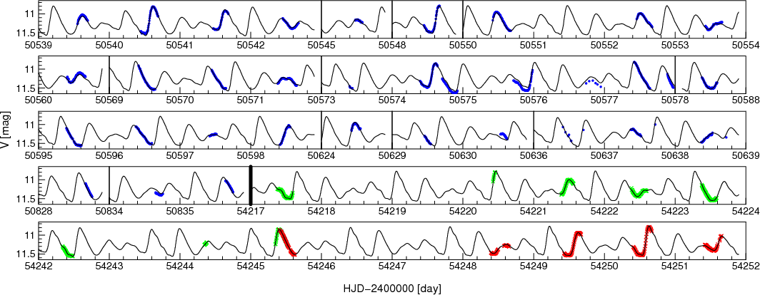 Figure 1: V light curve of V372 Ser. Blue, green, and red symbols denote observations of Garcia-Melendo et al. (2001), observations with the 1 m RCC telescope at Konkoly Observatory and the IAC80 telescope at Teide Observatory, respectively. Line: fitted Fourier solution Eq. (2). |
