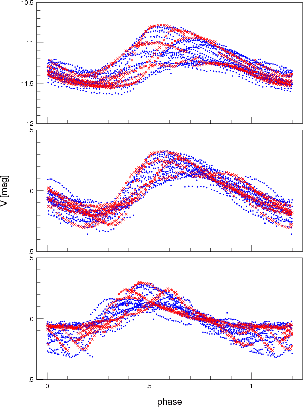 the frequency content of the light variations seems to be unchanged within the last ten years. To verify this conjecture we tried to perform a common fit of all the available V data. Because of the lack of data for 10 years, to unify the two data sets in a common Fourier analysis is not practical due to the very unfavourable window function. None of the further determined Fourier parameters (frequencies, amplitudes and phase) based only on either of the data sets gave us an acceptable fit for the unified data. Therefore, we refined the frequency analysis by a successive approximation on the combined data, where the residuals of the non-linear fit were minimized while the structure of the decomposition (number of harmonics and linear combinations) was fixed and the two frequencies were independently changed in their limiting intervals. As a result of this process we could fit the total light curve at the frequencies