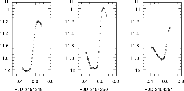 Three U light curves of night quality 1 are reproduced in Fig. 3. They are smooth: humps or bumps indicating atmospheric shocks are not present, in contrast with the ascending branch of e.g. (Obj)SU Dra(Obj) (Preston & Paczynski 1964; Barcza 2002). The duration of an ascending branch is