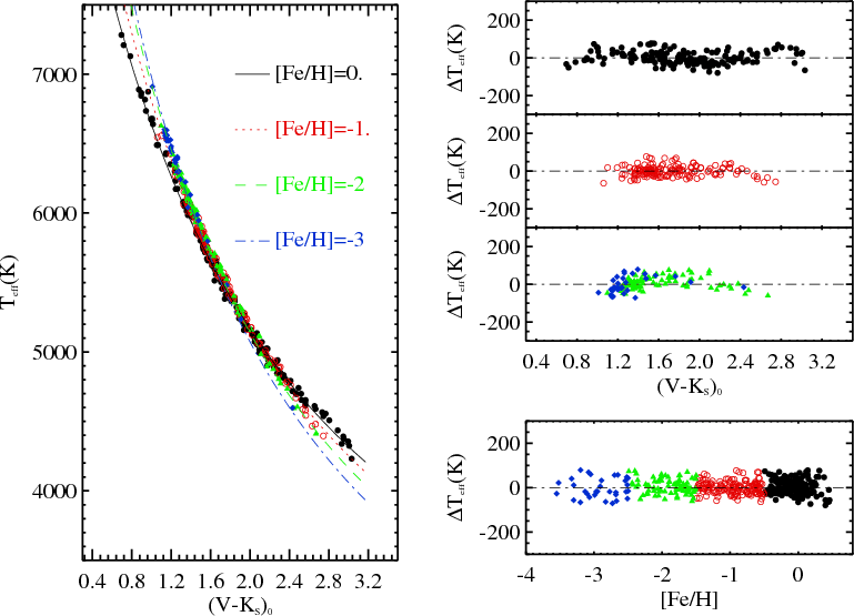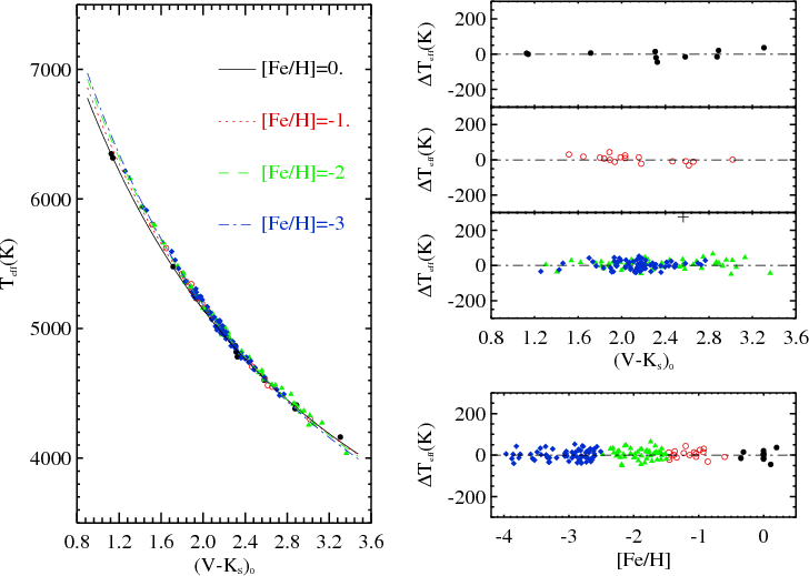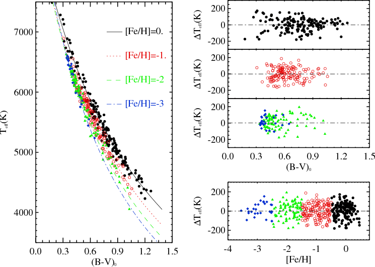 from the average (see text).![\begin{displaymath}\theta_{\rm eff}\!=\!b_0 + b_1 X + b_2 X^2 + b_3 X {\rm [Fe/H]} + b_4 {\rm [Fe/H]} + b_5