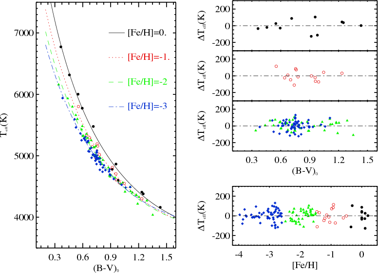 Popular indirect methods for deriving effective temperatures are the excitation equilibrium of Fe I lines (e.g. Santos et al. 2004,2005) and on fitting Balmer lines (e.g. Barklem et al. 2002; Fuhrmann et al. 1994,1993). Temperatures based on Fe I excitation equilibrium depend on the model assumptions, such as non-LTE effects, especially in metal-poor stars (see Shchukina & Trujillo Bueno 2001; Thévenin & Idiart 1999). Recently, Barklem (2007) has also raised concerns about possible non-LTE effects on the wings of Balmer lines. Both excitation equilibria (Asplund 2005) and Balmer lines (Ludwig et al. 2009, in prep.) are also sensitive to granulation effects. This makes such methods strongly model-dependent, which is an undesirable feature. However, temperatures derived from Balmer lines and Fe I excitation equilibria have the considerable advantage of being reddening independent.