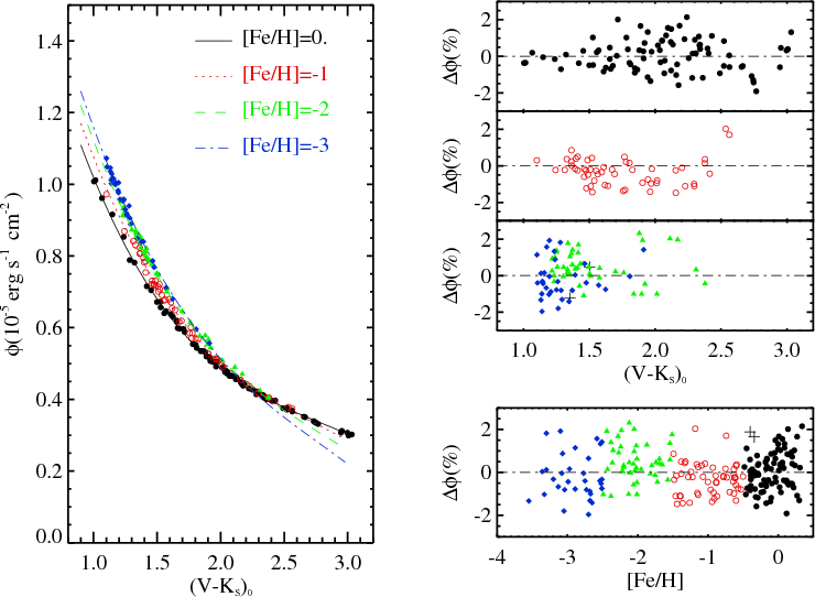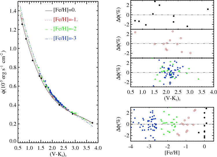 magnitudes. This is the main difference between our implementation of the IRFM and that of Ramírez & Meléndez (2005, ApJ, 626, 446, hereafter RM05), since to introduce new stars at the lowest metallicities they transform the 2MASS