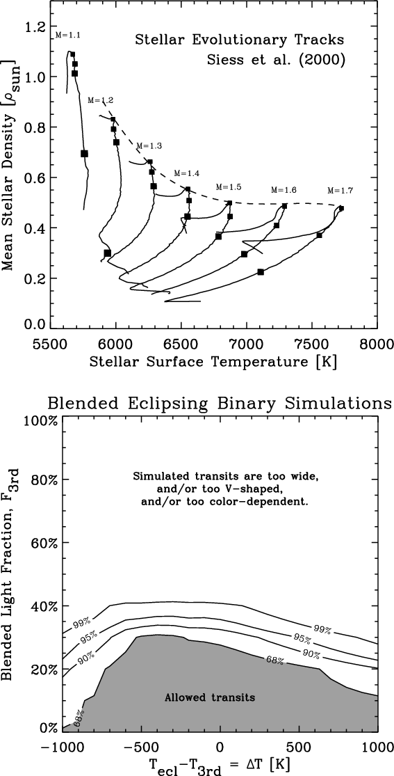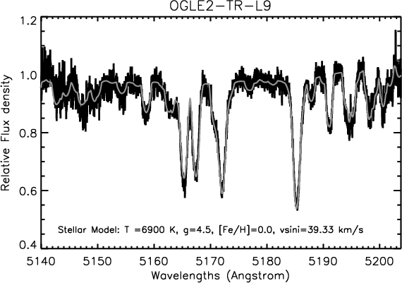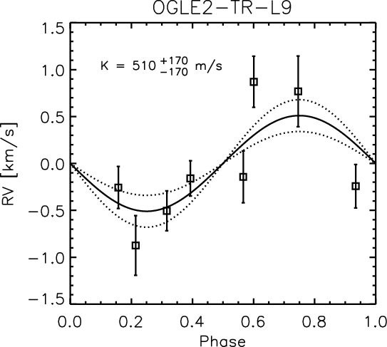 km s-1) F star. OGLE2-TR-L9 is also the star with the highest surface temperature (T=6933 K) of all main-sequence stars that host an exoplanet known to date. It is therefore unsurprising that the uncertainties in the radial-velocity variations are higher than for most other transiting exoplanets presented in the literature. Only because of the high mass of OGLE2-TR-L9b, were we able to detect its radial-velocity signature. We note, however, that since a blend scenario can be rejected at high significance, an upper limit to the mass of OGLE2-TR-L9b would have been sufficient to claim the presence of a transiting, extrasolar planet, although of unknown mass. Similar arguments may have to be used in the case of future detection of the transits of Earth-size planets from Kepler or CoRoT, since their radial-velocity signature may be too small to measure.