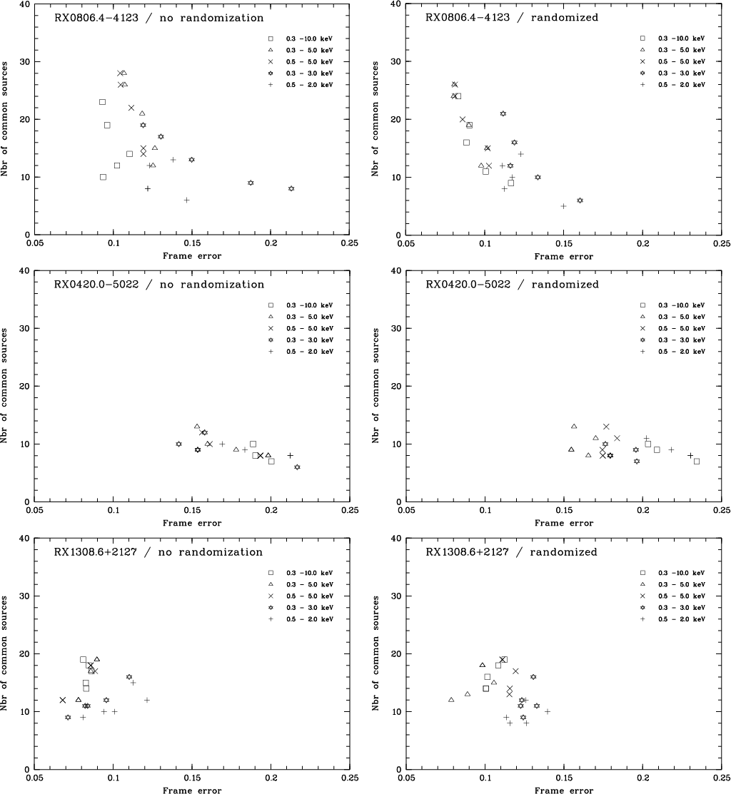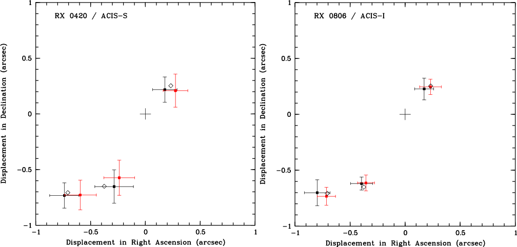 on the relative positioning of the two epochs. Because of the enhanced soft X-ray sensitivity of ACIS-S compared to ACIS-I, the two X-ray brightest targets, (Obj)RXJ0806.4-4123(Obj) and (Obj)RXJ1308.6+2127(Obj) would have suffered from pile-up in ACIS-S and would thus have likely produced biased X-ray positions. Using ACIS-I for these two sources provided the best compromise between the need to observe enough background sources and the requirement to have the best position for the INS target. However, for the fainter and much softer X-ray source (Obj)RXJ0420.0-5022(Obj), ACIS-I would have collected too few counts. Accordingly we chose to use ACIS-S at the expense of a smaller field of view. The total source count rates were of