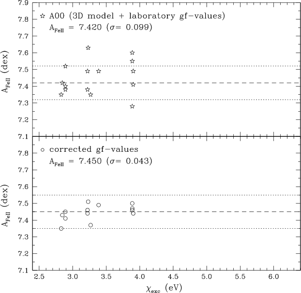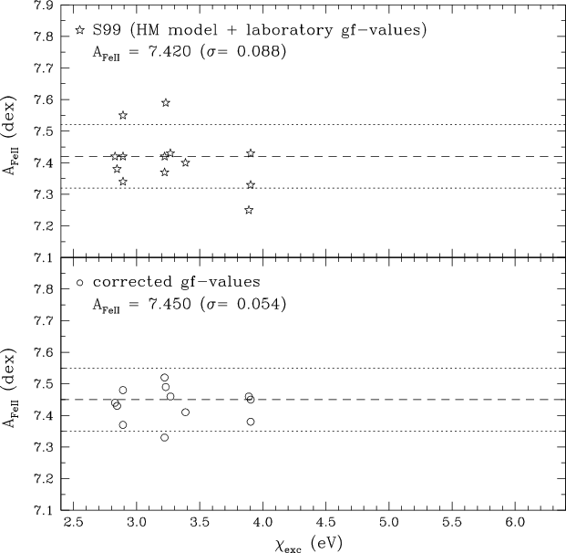 The robustness of Fe II is undermined by the uncertainty in their gf-values. As is well known in the literature, there is a lack of precise transition probabilities for Fe II lines, so that even the best available laboratory data introduce large uncertainties (at the level of 0.1 dex) in the determination of iron abundances (see e.g. Grevesse & Sauval 1999). New laboratory experiments and theoretical calculations (see Fuhr & Wiese 2006, and references therein) have not improved the situation, as will be shown in Sects. 3 and 4.