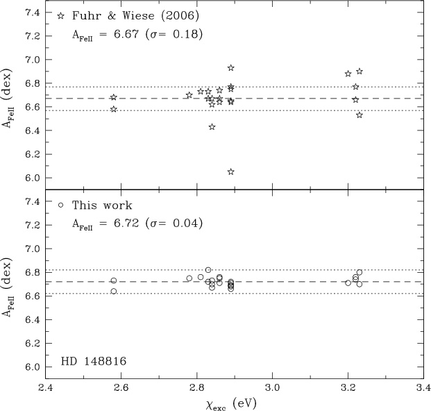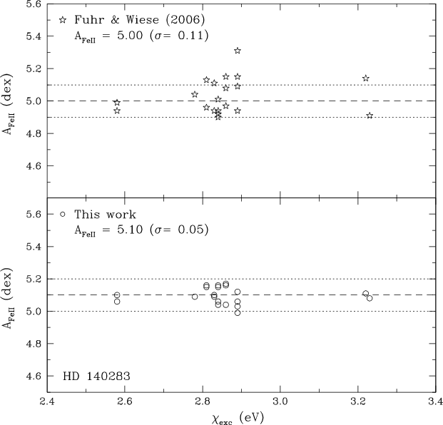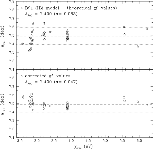 As discussed by Grevesse & Sauval (1999), it is very disappointing that accurate transition probabilities are known for only a very few Fe II lines, making the iron abundance obtained from Fe II very uncertain, with a line-to-line scatter as high as 0.1 dex.