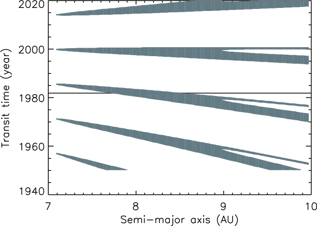 It is noteworthy that, if a planet orbiting at 8 AU transited in 1981, then it must be exactly