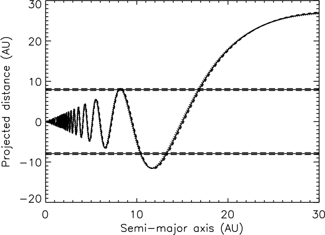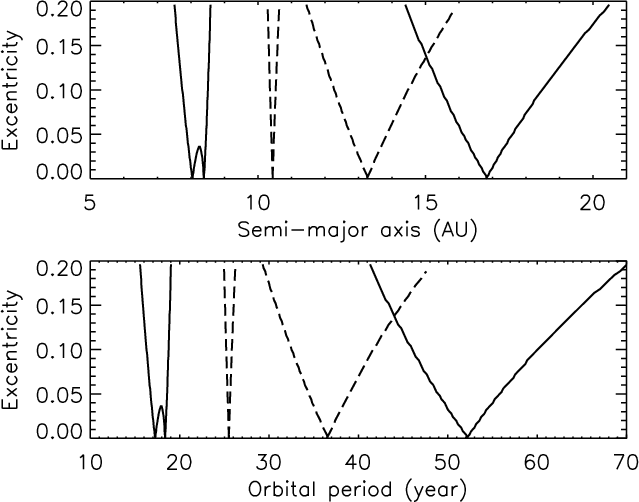8 AU, with an eccentricity of less than or equal to 0.1 and with a stellar mass of