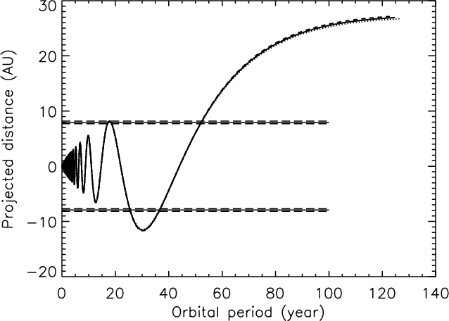 For a semi-major axis between 7 and 10 AU, we find a wide range