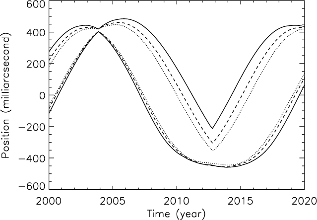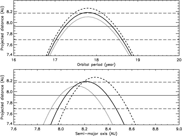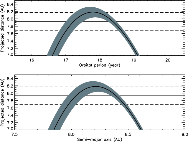 8 AU and was seen close to its quadrature position in the 2003 images. In this case, most of the uncertainties are related to error bars on the position in 2003. Uncertainties related to the stellar mass and orbital eccentricity are also discussed.