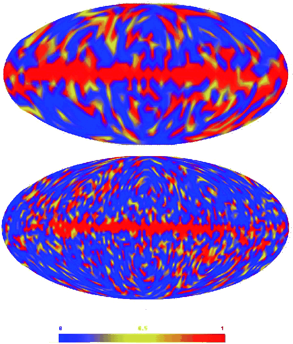 Figure 1: Kolmogorov maps i.e. the degree of randomness in CMB sky. WMAP's 5-year W-band, 94 GHz data are used; upper map is for Nside = 8, the lower for Nside = 16. The Galactic disk is clearly distinguished. |