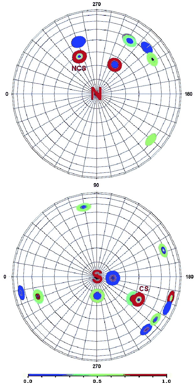Positions of the 20 cold spots, i.e. negative mean temperature regions, in the hemispheres. The Cold Spot (CS) and the Northern Cold Spot (NCS) are highlighted. The spots are stratified according to the randomness scale |