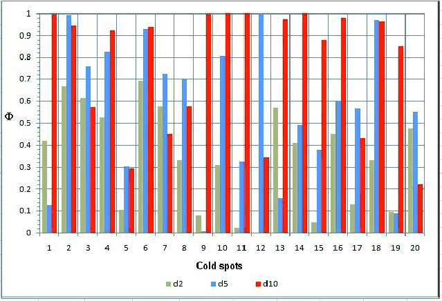 The stratification of the degree of randomness of 20 cold spots within 2, 5 and 10 |