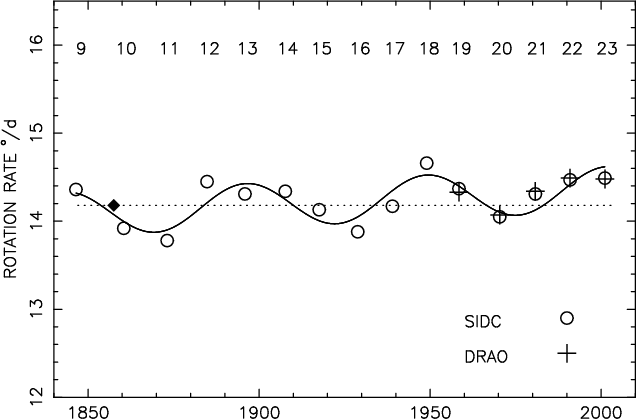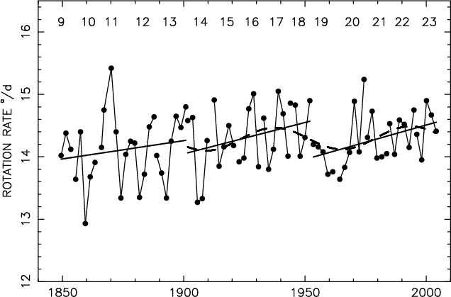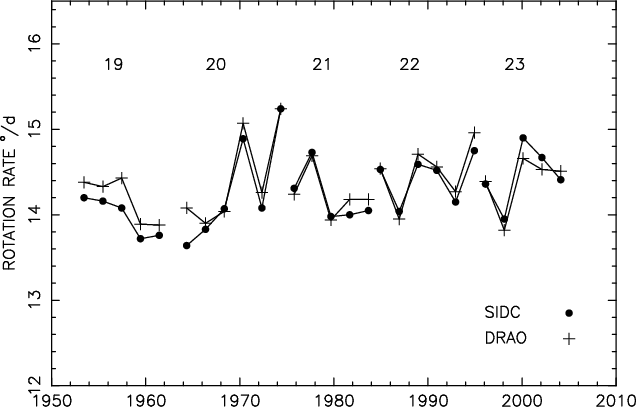 Table 1: Sidereal sunspot and coronal rotation rates for two year sequences of each cycle. For estimated error see Sect. 4.