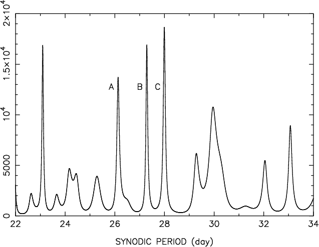 power spectrum frequency of rotation periods and found a periodicity of 32.6 y,