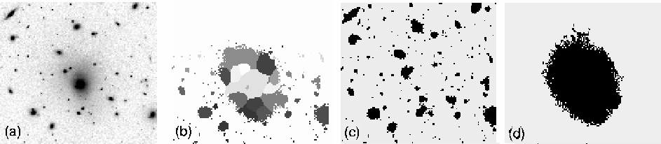 it is shown in panel (b). Clearly, the program has erroneously assigned pixels of the large galaxy to the small projected objects producing poor photometry of the large galaxy as well as of the