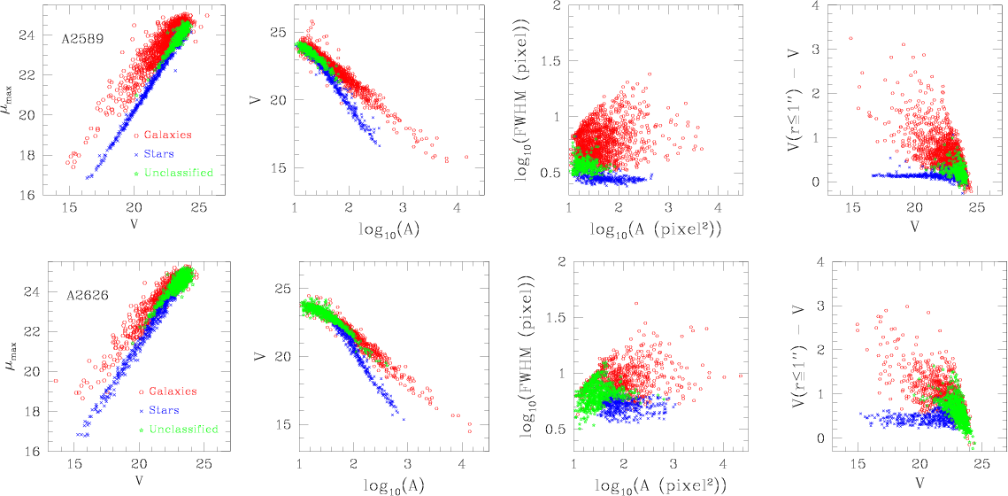 lower panels). Red squares are galaxies, blue crosses stars and green dots unclassified objects. For better visualization, only ![\begin{figure}