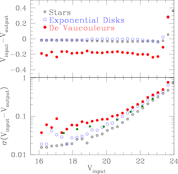 16%). From simulations we found that the uncertainty of our photometry is quite dependent of the light profile of the objects with stars having the most robust photometry and de Vaucouleurs profiles showing higher uncertainties and also an additional bias of