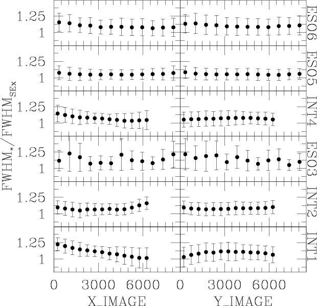 for stars in bins of 500 pixels (WFC@INT) or 700 pixels (WFI@ESO) along both axis. The errors have been computed as the scale biweight estimator (SBE).![\begin{figure}