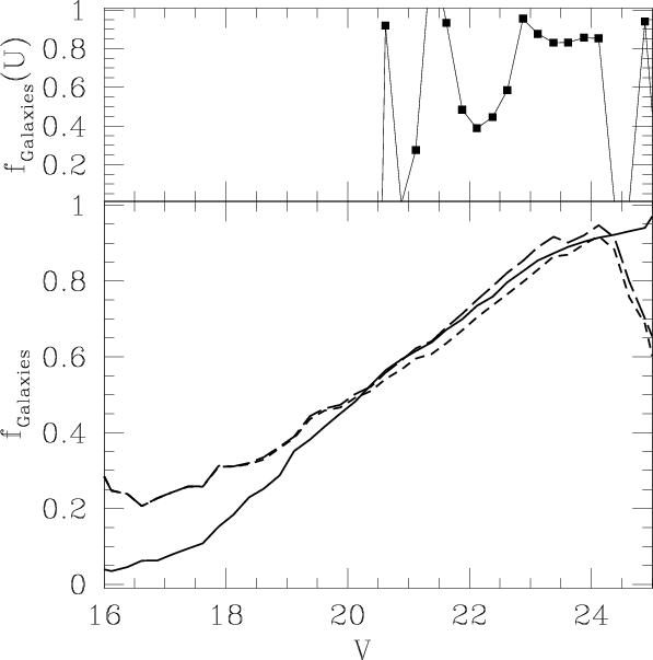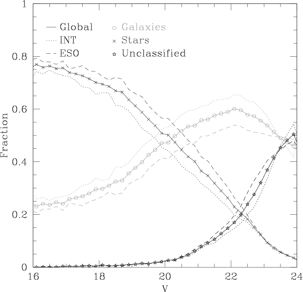 The star/galaxy classification of the bright objects (V<20) was checked visually making negligible the fraction of misclassified objects. For fainter objects, we found that simulations do not provide reliable estimates of the possible misclassification and therefore we have compared our data with that from deep counts of galaxies and star counts from models of our Galaxy. Both sets turned out to be consistent with our data within