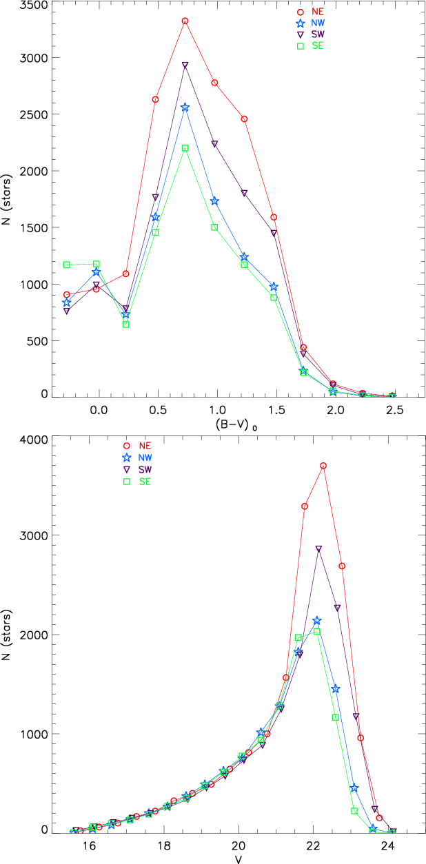 Figure 1: Upper: distribution of the colour of the stars according to their relative location in the camera. Lower: luminosity function of the stars according to their relative location in the camera. |