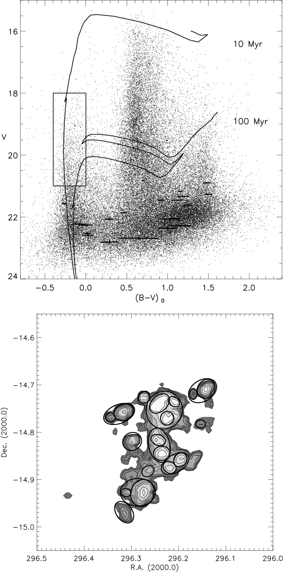 Figure 2: Upper: CMD diagram of NGC 6822 and photometric uncertainties in colour and magnitude of 30 stars randomly selected from the stellar catalogue. The rectangle includes the young stellar population that was used for the detection of star complexes, and its characteristic theoretical isochrones. Lower: detected star complexes of NGC 6822 (ellipses) plotted over the isopleths of the surface stellar density map of the young stars. |