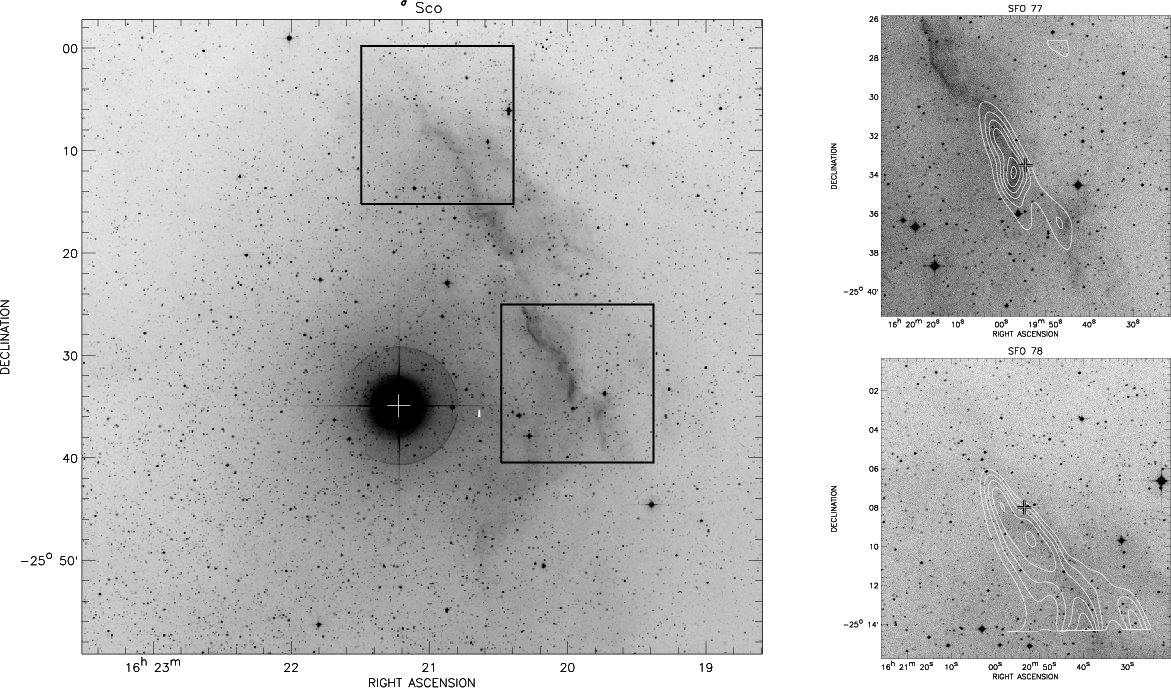 Sco where the spectral type and assumed distance are taken from Eggen (1998). The spectral types of HD 305938, CCDM J16212-2536AB, HD 326286 and HD 152245 have been drawn from SIMBAD. The SFO identification number, corresponding IRAS name and position in Galactic coordinates are given for each cloud in Table 2 and in Fig. 1 we present a plot of their distribution with respect to the Galactic plane.