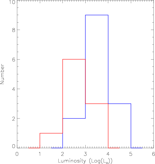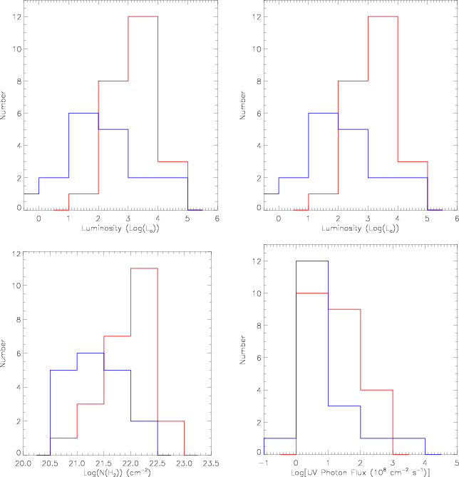 The IRAS point sources associated with BRCs are systematically much more luminous than IRAS sources associated with more isolated clouds and Bok globules, in fact approximately three orders of magnitude more luminous (Sugitani et al. 1991, 1994). This has led to the suggestion that the RDI mode of star formation may preferentially lead to the formation of more massive stars, or small clusters of intermediate mass stars (e.g., Dobashi et al. 2001; Morgan et al. 2008). Moreover, Sugitani et al. found systematically higher luminosity to mass ratios for IRAS sources within BRCs than for isolated clouds, suggesting that RDI may also lead to a higher star formation efficiency than would otherwise be observed.