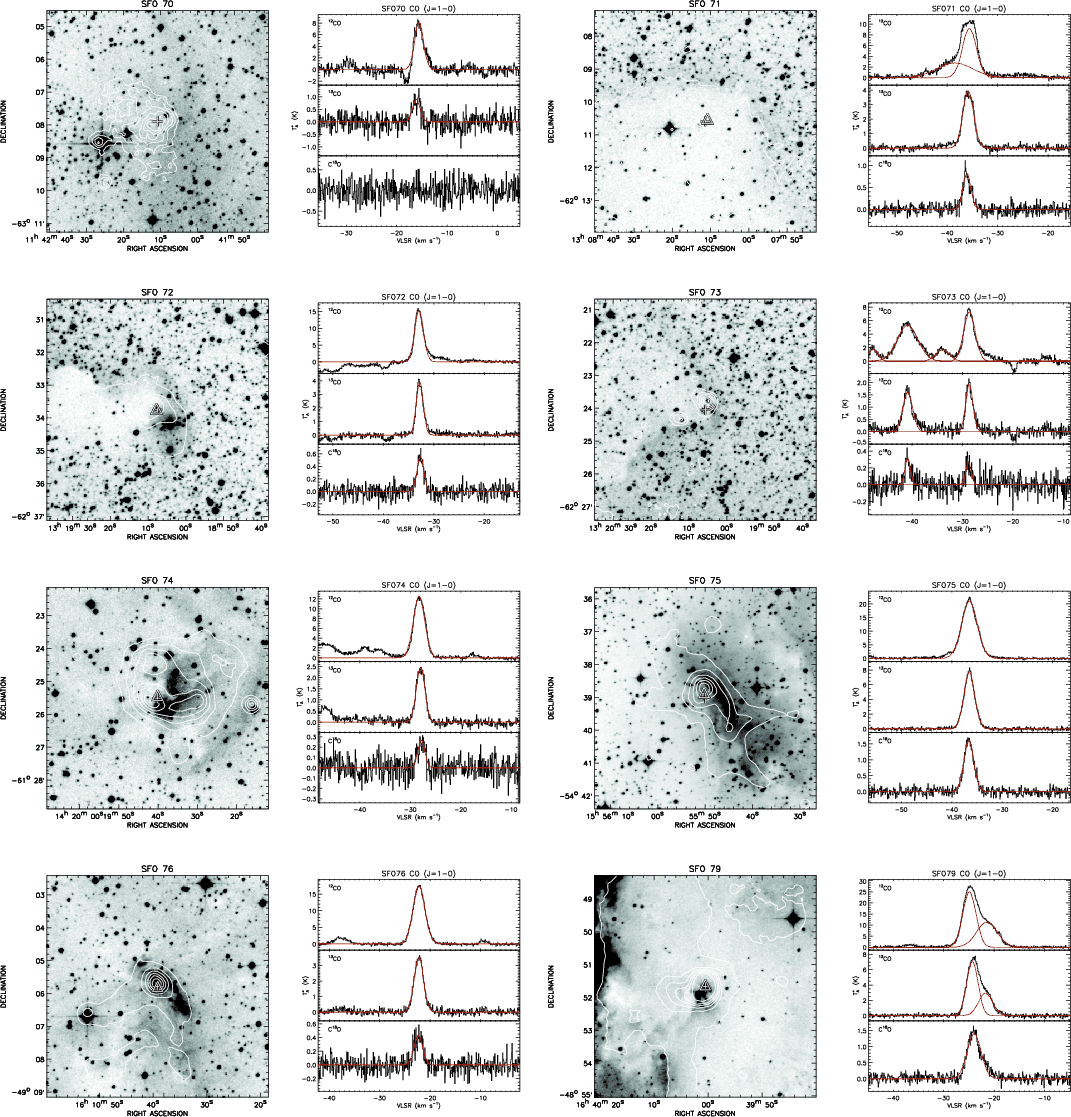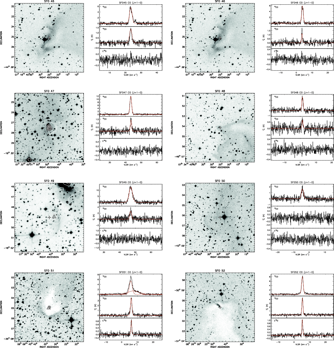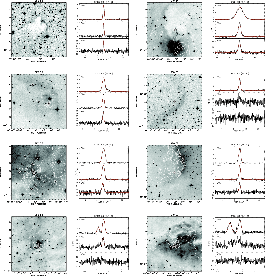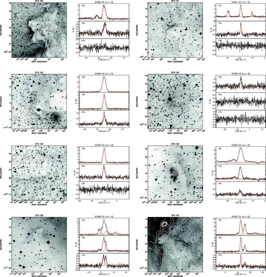 DSS images and CO spectra obtained towards the 42 BRCs towards which emission is detected. The DSS images presented in the left panels are overlaid with contours of the MSX 8 |
