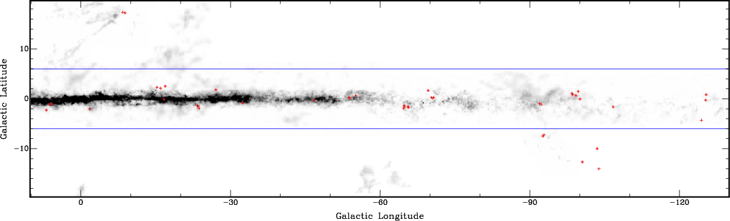Figure 1: Galactic distribution of the southern catalogue of BRCs. The greyscale shows the distribution of molecular gas as traced by the integrated 12CO map of Dame et al. (2001). The positions of the southern sample of BRCs are indicated by red crosses. The area between the blue lines indicates the region covered by the MSX survey (see text for details). |