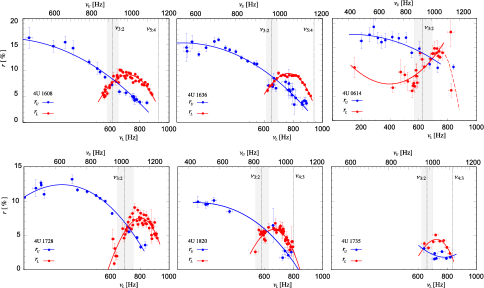 From here on, we adopt the convention of calling the two peaks forming twin kHz QPOs the lower and upper QPO and denote their frequencies as