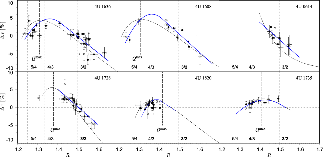 For the four sources (4U 1608-52, 4U 1636-53, 4U 1820-30, 4U 1735-44), and marginally also for 4U 1728-34, there is evidence for of another root (close to R= 1.33 or 1.25) where the available data terminate. Most of datapoints in Fig. 2 appear close to the roots R1 or / and R2. We therefore suggest that there could be a link between the previously reported ratio clustering and the existence of R1,2, which requires further investigation.