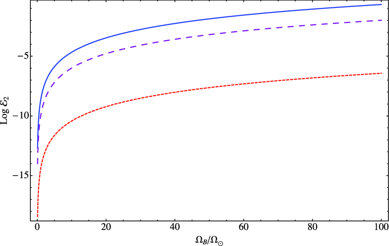 J2=10-3 (red dashed line), 10-2 (purple long-dashed line), 10-1 (blue solid line). The non-punctual terms have to be taken into account for strongly deformed perturbers (