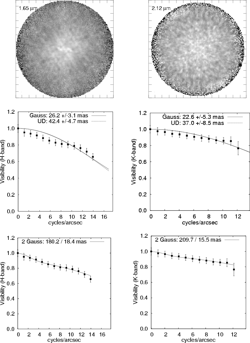 Figure 1: Measured diffraction-limited two-dimensional visibilities of V645 Cyg in the H-band ( top left) and K-band ( top right) as a function of spatial frequency in cycles/arcsec on both axes. Radial dependence of the azimuthally averaged two-dimensional visibilities is shown together with one-component Gaussian and uniform disc (UD) fits ( middle panels) as well as two-component Gaussian fits ( lower panels). The H-band data are presented in the left column, and the K-band data in the right column. The fit range is up to the telescope cut-off frequency. The numbers are the FWHM diameters of the large/small component of the two-component model (see Table 3). |