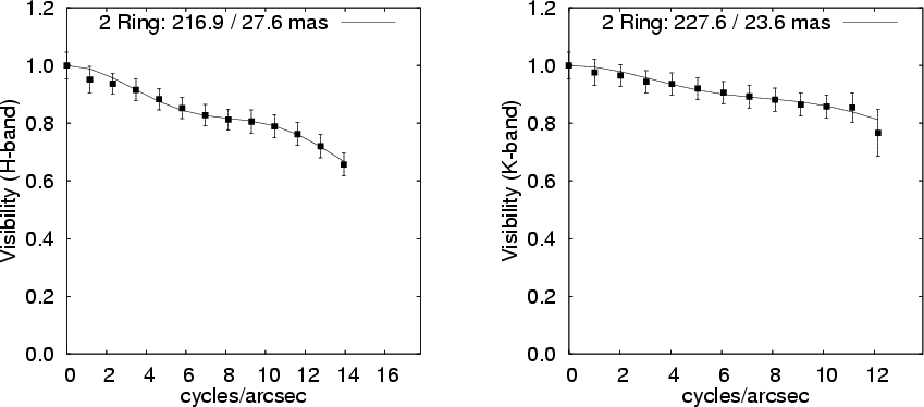 Figure 2: Visibilities of the best-fitting two-component models consisting of two centered rings fitted to the azimuthally averaged measured visibilities. The thickness of each ring was assumed to be 20% of the ring diameter. The fit range is up to the telescope cut-off frequency. The listed numbers are the diameters of the large/small component of the two-component model (see Table 4). |