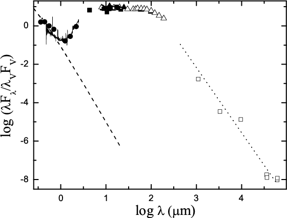 The dotted line through the long-wavelength part of the SED shows a blackbody fit to the data. The fluxes are normalized to that in the V-band, wavelengths are given in microns.![\begin{figure}
