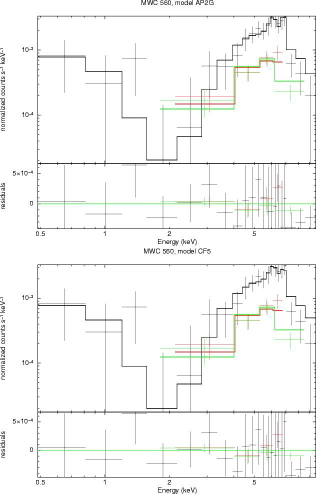 Figure 2: Observed spectrum of MWC 560 together with several models: our best fit models with an absorbed soft APEC model and another absorbed hard APEC model plus a Gaussian ( top) and an optically thin thermal emission from an isobaric cooling flow with a maximum temperature plus a Gaussian, both absorbed, and an additional absorbed soft thermal component ( bottom); also shown are the residuals for each fit. The colors correspond to different instruments: PN (black), MOS1 (red), MOS2 (green). |