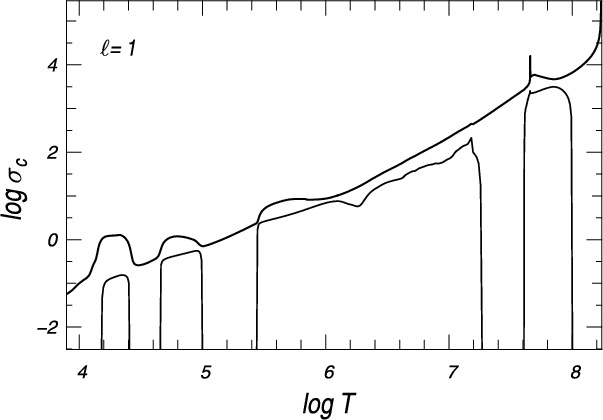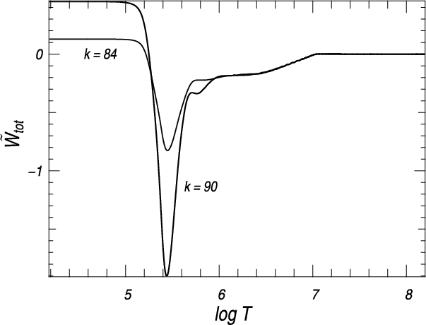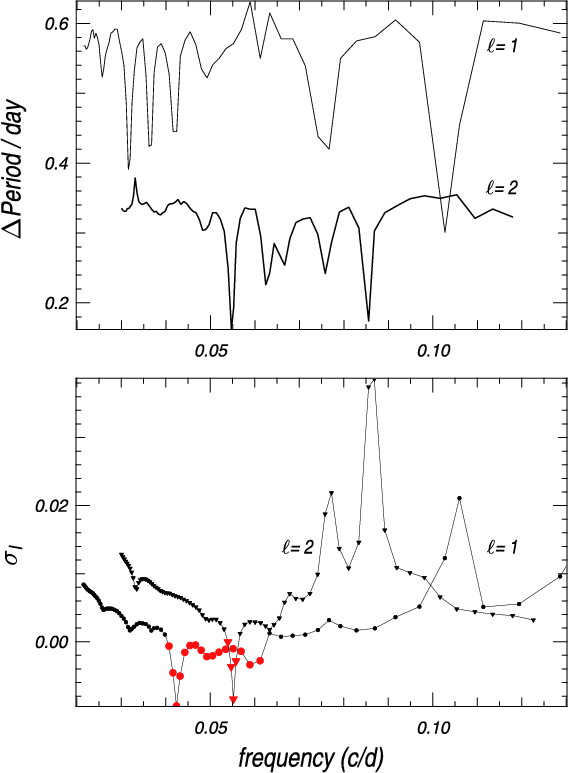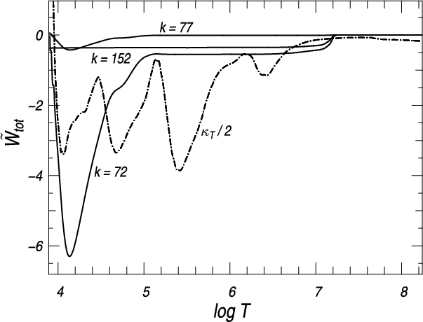 Total work integrals of the oscillation modes highlighted in Table 1 are presented in Fig. 8; it displays the total work divided by 1047 of overstable dipole modes with radial order k=72, 77, and of the stable mode with k=152. For illustration, the spatial variation of the opacity derivative