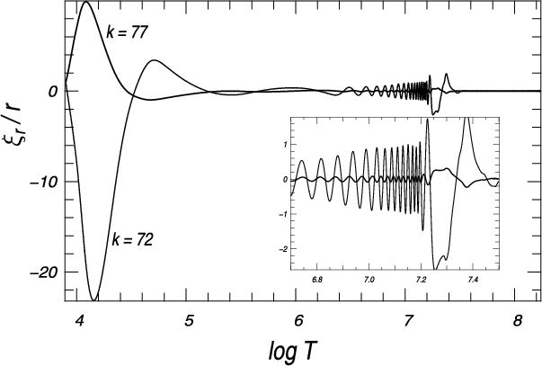 is added to the plot. The two untrapped modes (k=72,152) pick up damping in the deep interior, above the supra H-shell CZ, where the eigenfunctions oscillate rapidly. The trapped, overstable mode with k=77 does not experience noticeable damping in the deep interior; local dissipation of pulsation energy of this mode, as well