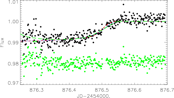 respectively. The planetary transit is detected in both datasets at the same timing. Top: superimposed