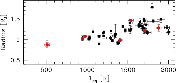 Figure 4 shows the increasingly clear correlation between equilibrium temperature and size for transiting gas giants. The relation holds for both massive planets (>2