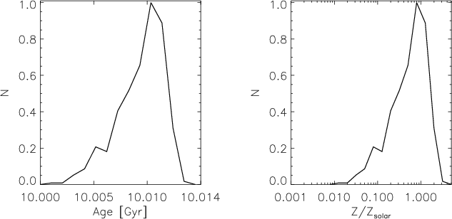 Using these parameters the best model is found for a burst of 8 Gyr, although it is almost indistinguishable from models with ages of 9 and 10 Gyr. The metallicity distribution found is consistent with metallicity distributions in the literature based on spectroscopic results.