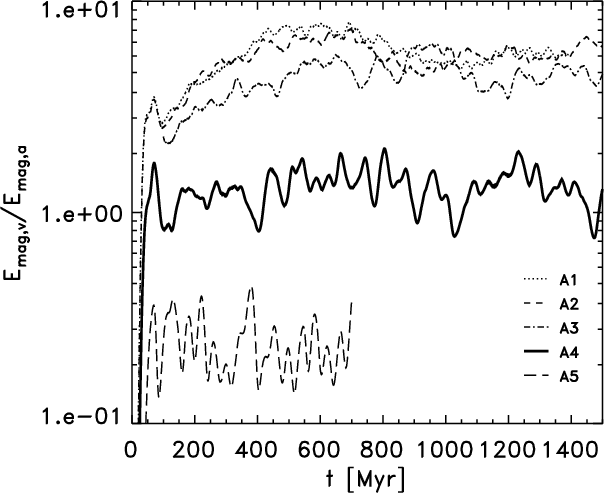 - We recall problem indicated previously by Snodin et al. (2006), that in all simulations the CR energy in the computational domain exceeds the turbulent kinetic energy and magnetic energy by more than one order of magnitudes. The lowest ratios of CR to kinetic energies also correspond to the highest values of the parallel diffusion coefficient. It seems implausible, however, that an increase in the diffusion coefficients to fully realistic values would reduce the excess of cosmic-ray energy in the disk. It also seems that the ratio of CR to other forms of energy in the ISM is not yet well constrained on observational grounds (Strong et al. 2007). On the other hand, the currently used shearing-box approximation does not permit CRs to leave the disk by means of diffusion along the predominantly horizontal magnetic field. Therefore, we suggest that future studies of the CR-driven dynamo, designed to solve this problem, should be completed in the framework of global galactic-disk simulations.