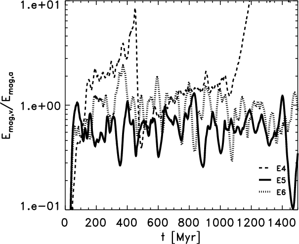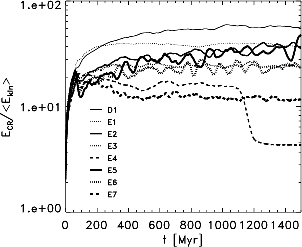 Figure 11: Time evolution in the ratio of CR to time-averaged kinetic energy for different values of the CR diffusion coefficients in simulation series E. Line assignments are the same as in Fig. 9. |