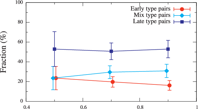 0.76, a property also observed for galaxies with increasing stellar masses. Early-type pairs (dry mergers) increase their relative fraction from